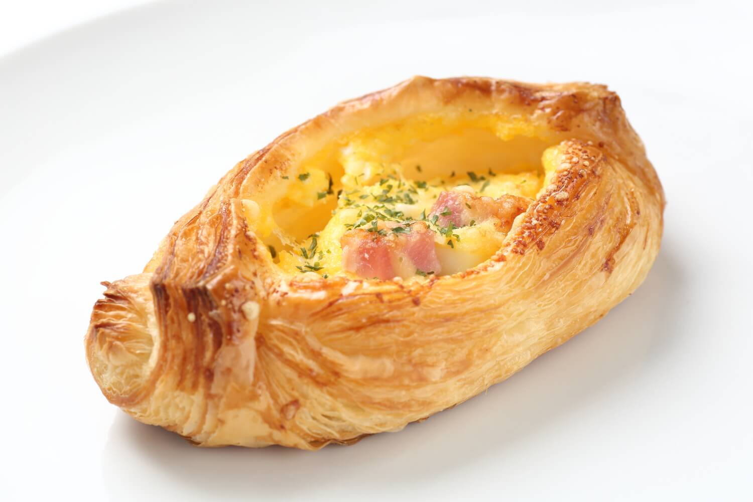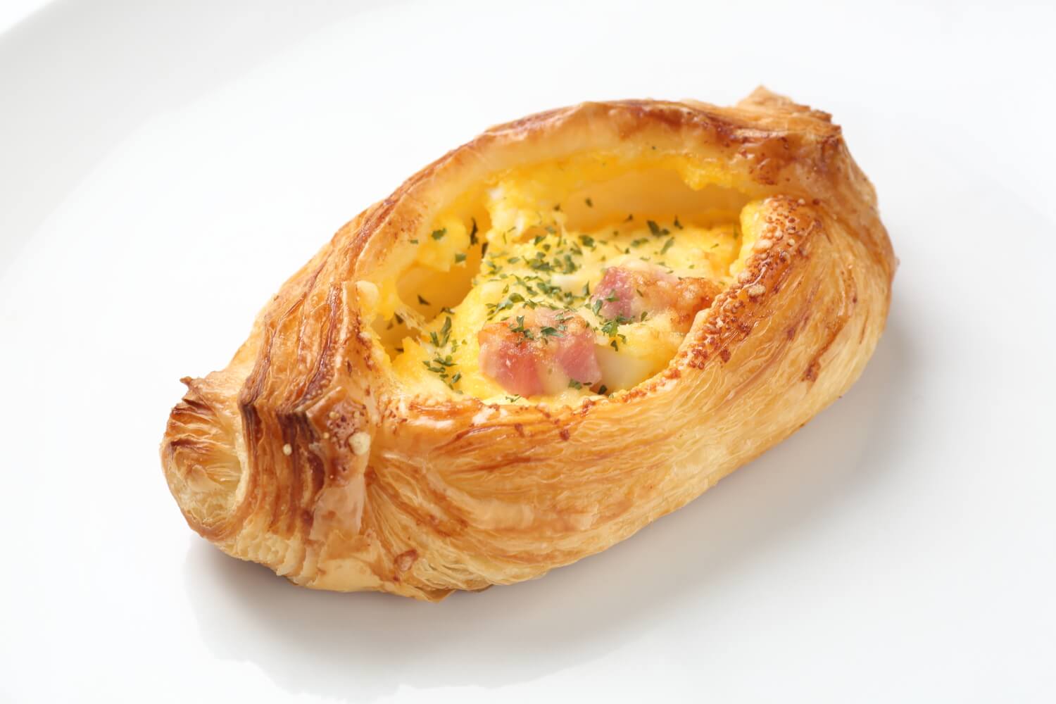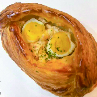 クロワッサン生地に自家製タマゴサラダをたっぷり詰めて、パルメザンチーズ、ベーコンといっしょに焼き上げました。