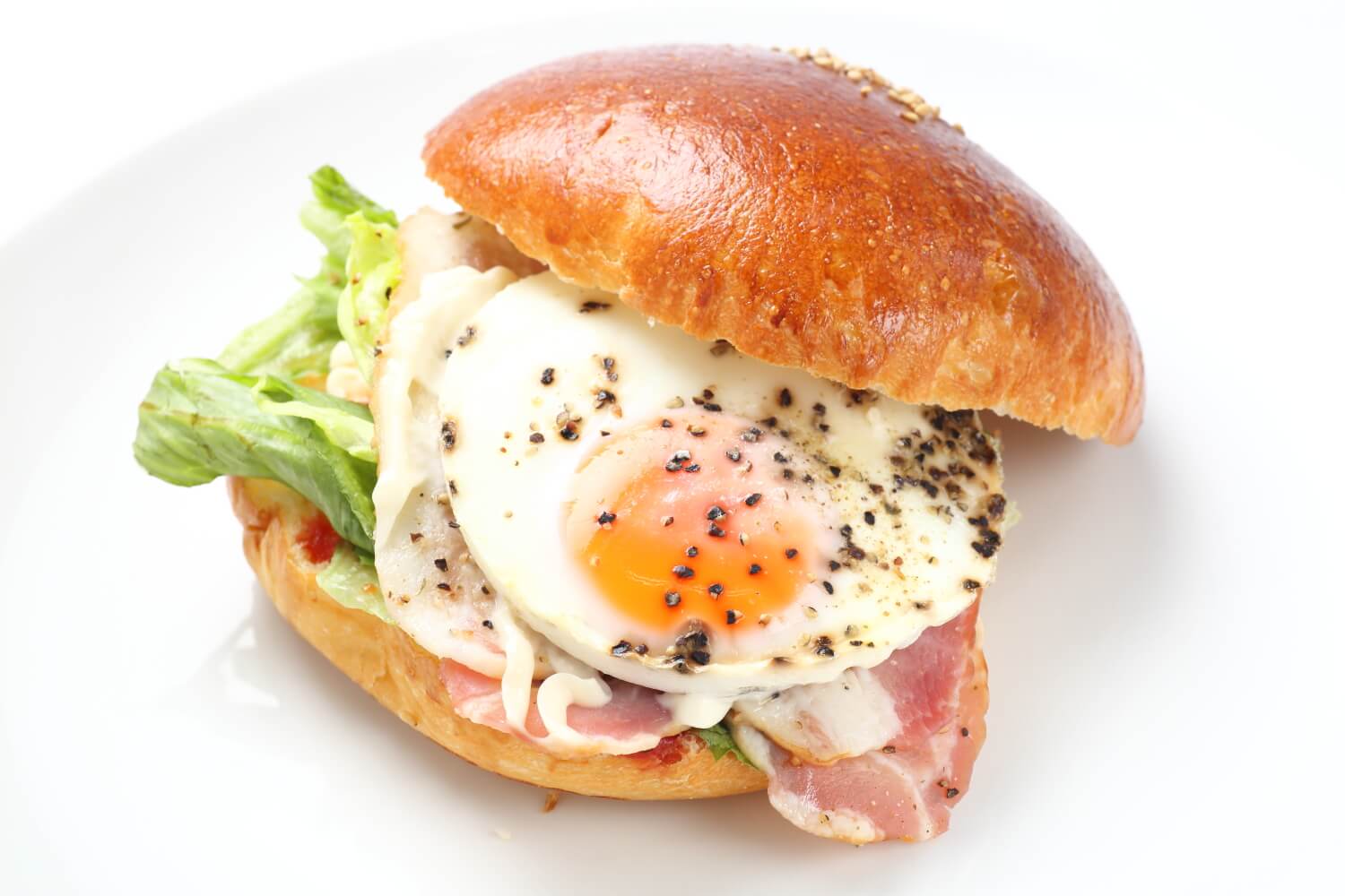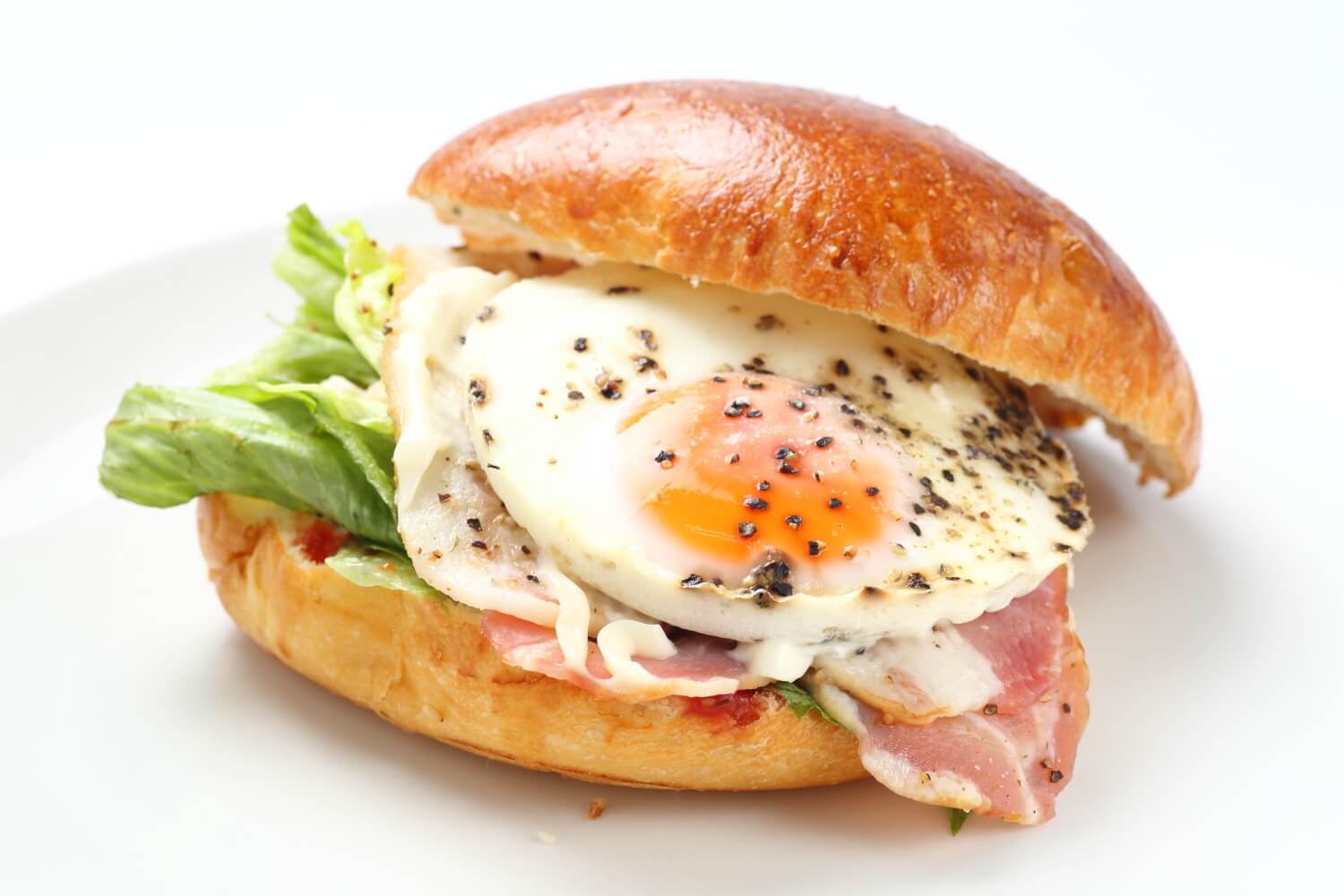 目玉焼き、ベーコン、レタスをはさんだバーガータイプのパン。朝ごはんやランチにちょうどいいサイズです。