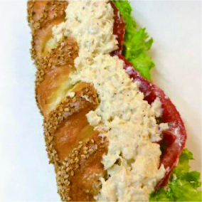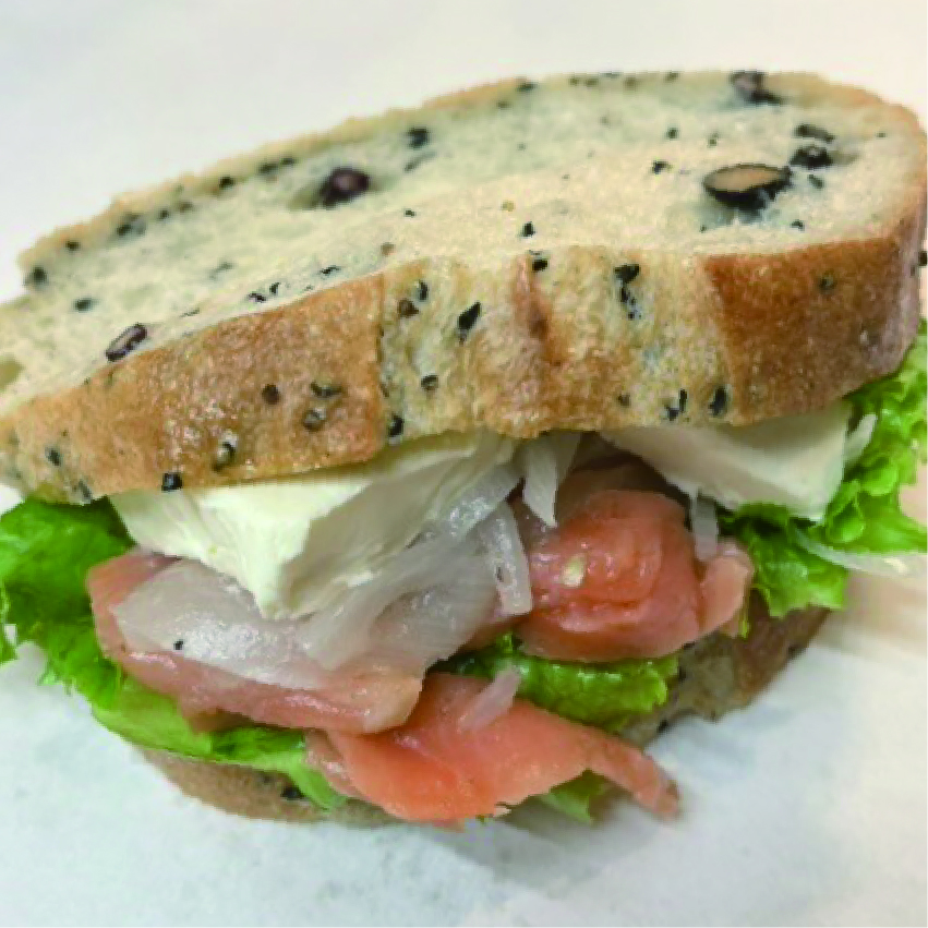 香ばしい五穀を練り込んだフランスパンにスモークサーモンとオニオンマリネとキリのクリームチーズをたっぷりサンドしました。